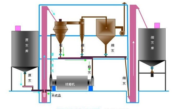 粉煤灰磨細(xì)、分選工藝說明:粉煤灰粉磨系統(tǒng)主要由原灰倉,葉輪給料器、電子計(jì)量稱、粉煤灰專用球磨機(jī)、選粉機(jī)、氣箱脈沖布袋除塵器、引風(fēng)機(jī)、螺旋輸送機(jī)、斗式提升機(jī)、給料機(jī)、控制系統(tǒng)等組成。系統(tǒng)直接由原灰倉下取灰,經(jīng)葉輪給料器給料,電子稱稱重后由螺旋輸送機(jī)輸送進(jìn)入磨尾提升機(jī),粉煤灰由提升機(jī)喂入選粉機(jī)進(jìn)行磨細(xì)前的分選,分選后的粗灰經(jīng)螺旋輸送機(jī)送入磨機(jī)進(jìn)料口,進(jìn)入球磨機(jī)研磨,經(jīng)磨機(jī)研磨后的物料中含有大量細(xì)灰,再次由提升機(jī)喂入選粉機(jī)分選,分選出的細(xì)灰經(jīng)后續(xù)螺旋輸送機(jī)送入成品灰?guī)欤C(jī)通風(fēng)除塵與選粉機(jī)細(xì)粉布袋除塵器共用;采用此種閉路研磨工藝與開路(無選粉機(jī))系統(tǒng)相比可提高臺(tái)時(shí)產(chǎn)量30~40%以上。